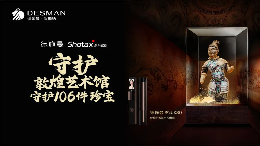 行业首个与紫禁城IP联名智能锁德施曼玄武•紫禁城K80,将科技融入古典,外观设计源自紫禁城宫廷建筑,内置23片精密齿轮、11颗奢华红宝石、144颗独立零件。今年9月,德施曼匠心之作玄武·紫禁城K80正式签约成为“敦煌艺术馆合作用锁”,德施曼独家突破性技术Shotax哨兵猫眼守护敦煌艺术馆,守护106件珍宝。